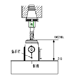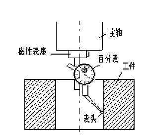 如圖 2 所示,用磁性表座將百分表粘在機床主軸端面上,手動或低速旋轉(zhuǎn)主軸。然后手動操作使旋轉(zhuǎn)的表頭依 X 、 Y 、 Z 的順序逐漸靠近被測表面,用步進移動方式,逐步降低步進增量倍率,調(diào)整移動 X 、 Y 位置,使得表頭旋轉(zhuǎn)一周時,其指針的跳動量在允許的對刀誤差內(nèi)(如 0.02mm ),記下此時機床坐標系中的 X 、 Y 坐標值,即為所找孔中心的位置。